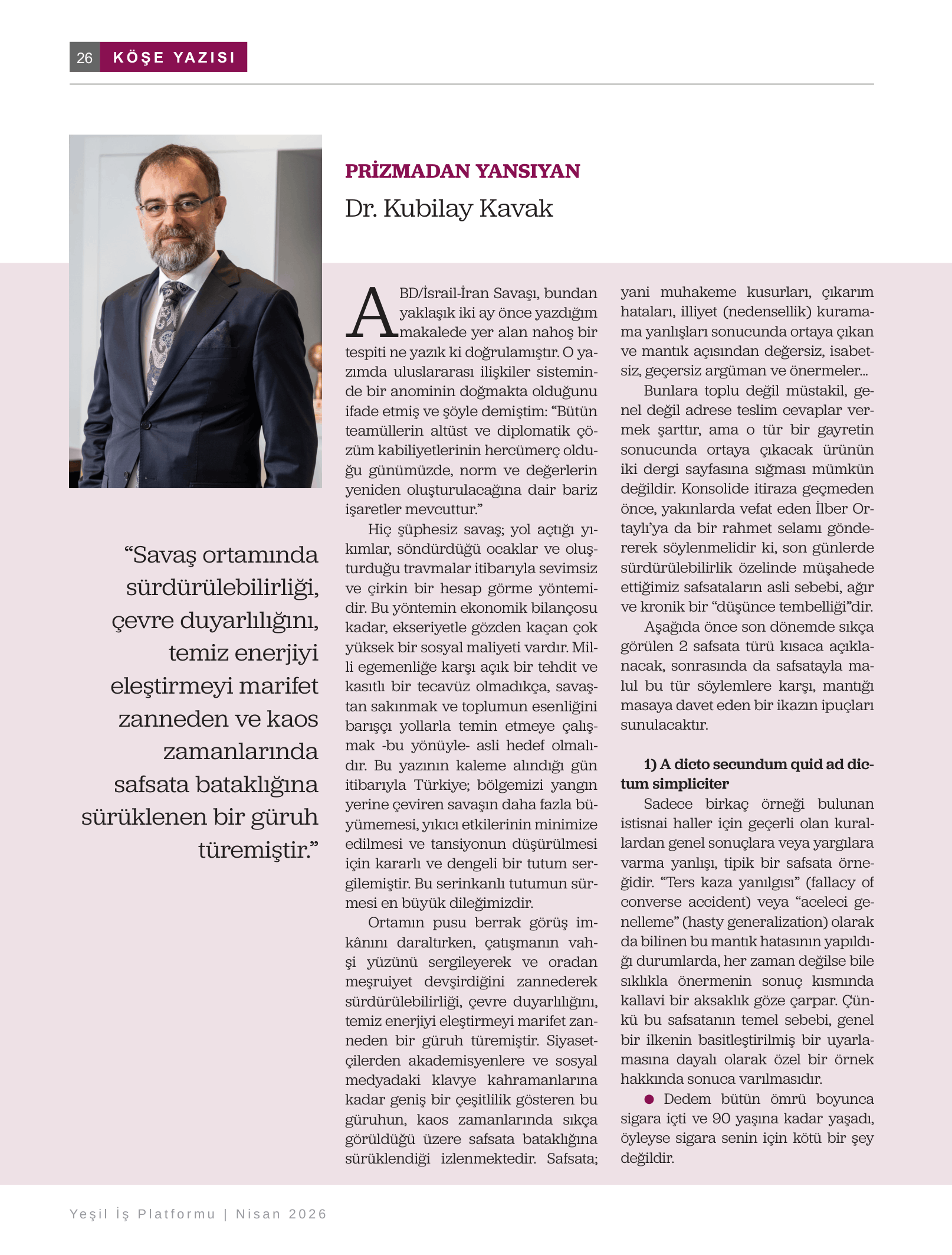 Dr. Kubilay Kavak, Yeşil-İş Platformu dergisindeki “Prizmadan Yansıyan” başlıklı köşe yazısında COP31 hakkında değerlendirmelerde bulundu. Dr. Kavak, yazısında “Savaş ortamında sürdürülebilirliği, çevre duyarlılığını, temiz enerjiyi eleştirmeyi marifet zanneden ve kaos zamanlarında safsata bataklığına sürüklenen bir güruh türemiştir.” dedi.
